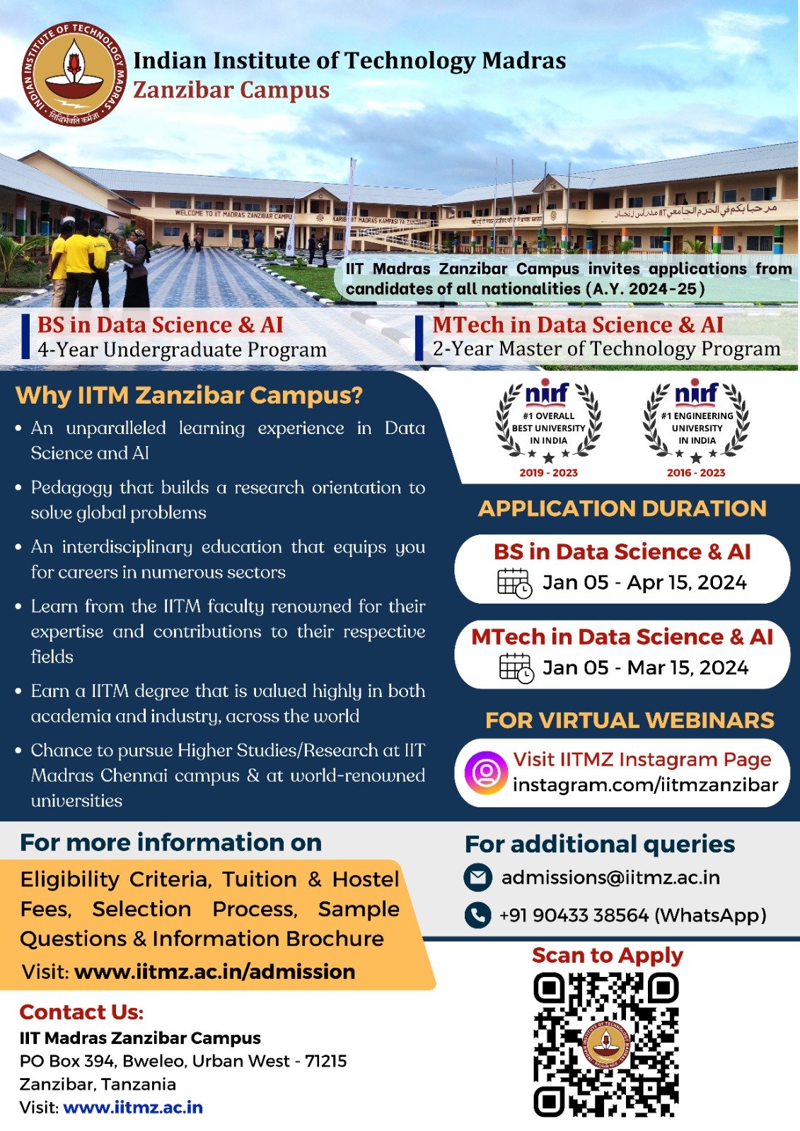 IITM launched its first International Campus Zanzibar (Tanzania) in 2023 to make cutting edge education and research accessible to the students in the African Continent. The institute offers a four year Bachelor of Science and a two year Master of Technology course in the area of Data Science and Artificial Intelligence. For further information, www.iitmz.ac.in may be visited. Application duration is from Jan 05 – April 15, 2024 for Bachelor of Science in Data Science & Artificial Intelligence and Jan 05 to March 15, 2024 for Master of Technology course in the area of Data Science & Artificial Intelligence.